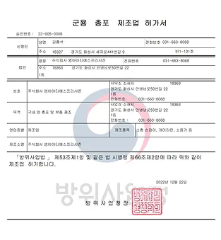 군용총포 제조업 허가(2022.12.22.)